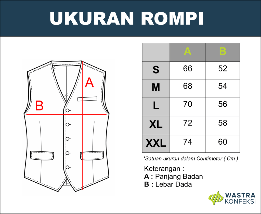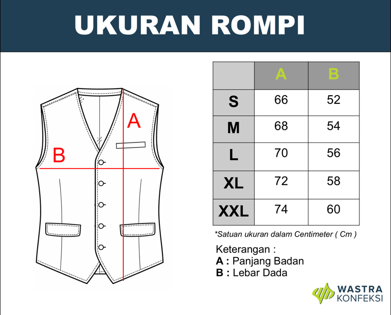 Tabel ukuran rompi/vest ini disusun untuk membantu Anda memilih size yang tepat sesuai standar produksi Wastra Konveksi. Bandingkan dengan ukuran tubuh Anda agar hasil nyaman, pas, dan tetap terlihat rapi serta profesional.